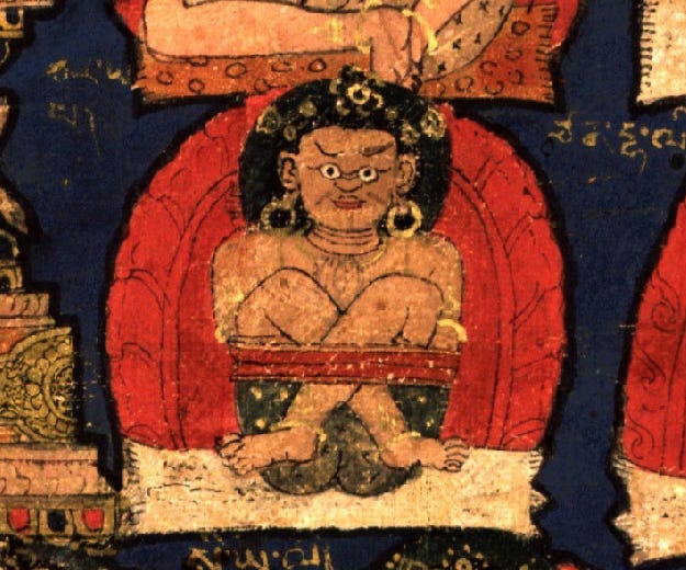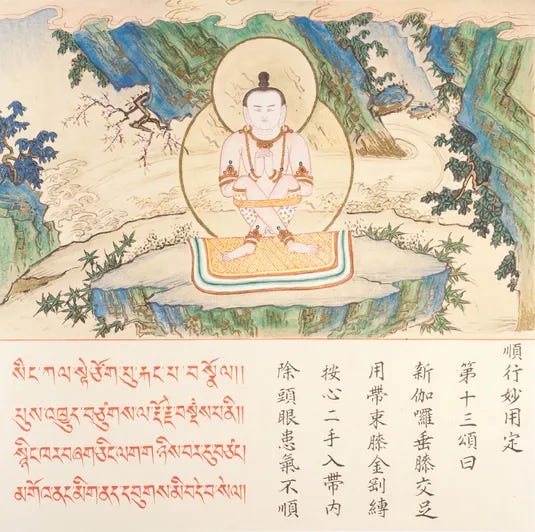 This posture is built upon the foundational sevenfold posture [look at previous post]: the spine is kept straight, the shoulders drawn slightly back, the neck slightly bent, and the tongue resting against the palate. The distinguishing features lie in the specific arrangement of the arms and legs, together with the use of a strap to stabilise the lower body.