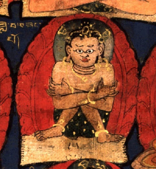The full name of this posture is “Strapping the Six Fire-Pits” (me thab drug ’ching ba or thab ‘gal). It is referred to as “six fire-pits” because the arrangement of the arms and legs forms six triangular shapes (trikoṇa / gru gsum), resembling the structure of a traditional fire-pit.